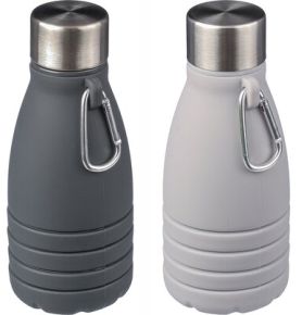 Gourde pliable en silicone, acier inoxydable, PP et aluminium.
