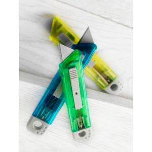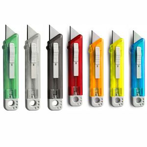 Plastique translucide avec lame rétractable.