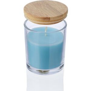 Bougie parfumée dans un verre avec couvercle en bambou.