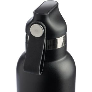 Une bouteille thermos en acier inoxydable à parois doubles en acier inoxydable et une poignée pour un transport facilité.